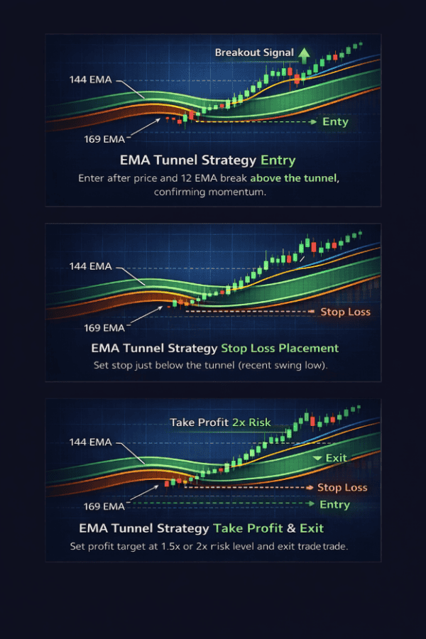 - The tunnel (144/169 EMA) acts as a trend filter: above = bullish bias, below = bearish bias.